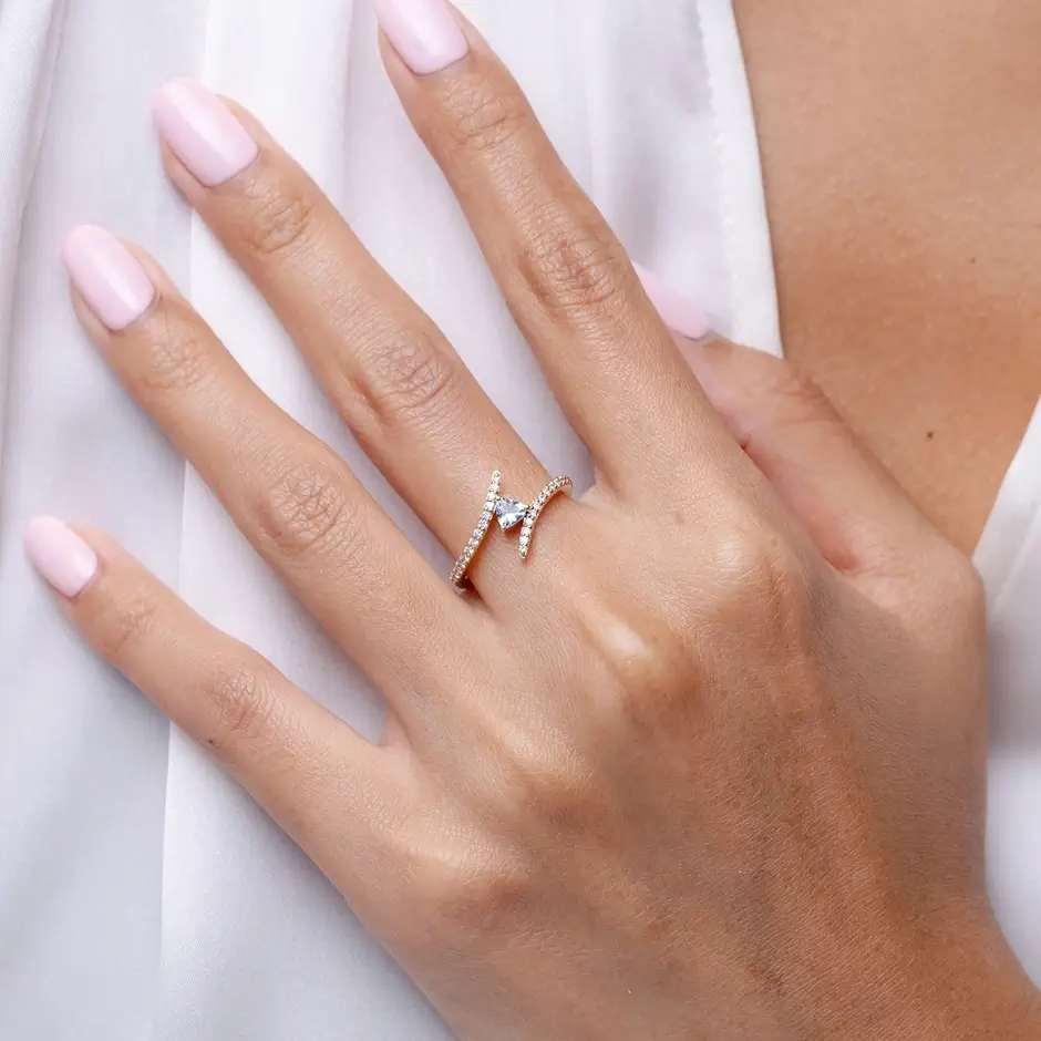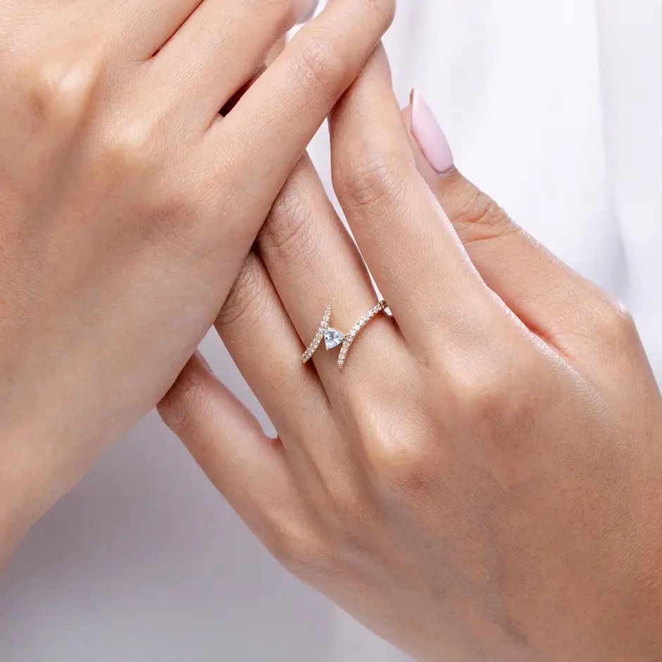 این یک حلقه زیبا با الهام از زودیاک است که برای زن ماهی طراحی شده است. ساقه بای پس نشان دهنده دو ماهی است که در جهت مخالف شنا می کنند – نمادی که با این علامت خورشید مرتبط است. الماس های خیره کننده جذابیت تریلیون آکوامارین یک نفره در مرکز را برجسته می کنند.